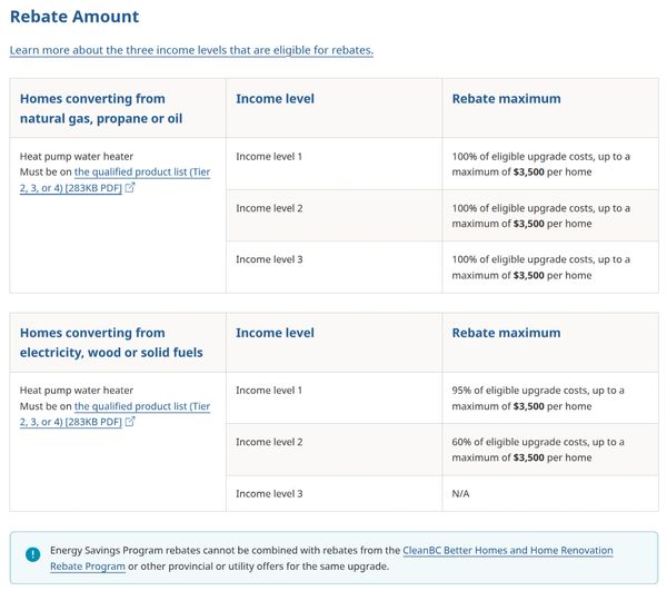 When switching off a gas or electric hot water tank, Income Level 1 and 2 will receive $3500 towards a heat pump hot water tank. Level 3 will only qualify for this rebate if switching off gas.